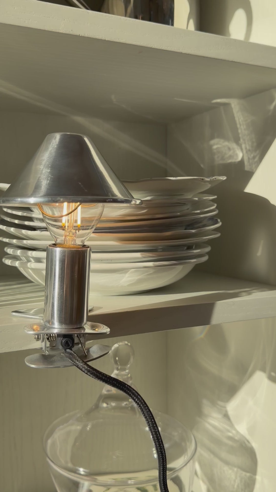 Fin lille klemmelampe fra Frankrig med den fine detalje at skærmen sættes fast på selve pæren. Klemmes fast på en hylde, en bunke bøger, reolen, vindueskarm eller hvor man lige synes det kunne være hyggeligt med lidt ekstra lys.
